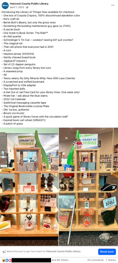 A spoof post presenting an exaggerated version of the library’s “Library of Things,” featuring intentionally ridiculous items as an April Fool’s Day joke.